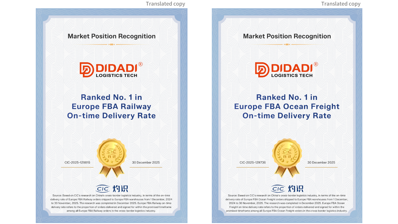This certification reflects sustained operational performance across the market, not isolated cases or self-reported data. It confirms DIDADI’s ability to deliver cargo to European Amazon FBA warehouses within committed timelines, at scale, and over long periods of time.